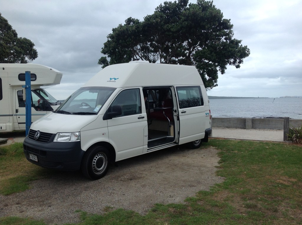 Prileteli smo torej ob načrtovanem času in tudi prijazne gospodične iz podjetja, kjer sva najela kombi, so naju hitro pobrale. Opravili smo vse potrebne formalnosti, v bližnjem supermarketu sva se oskrbela z začetnimi dobrinami in zapeljala v kamp Takapuna severno od Aucklanda. Najprej po dobrodošlo prho, naseljevanje predalčkov in zdravilni dveurni spanec. Tole je že likof: