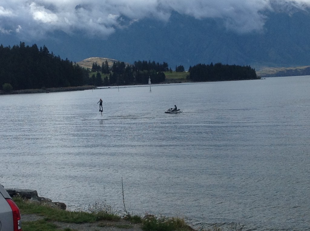 Queenstown za razliko od večine krajev na NZ ne počiva in ne vabi obiskovalcev, naj noč preživijo v udobnem hotelčku, čez dan pa naj pridno pritiskajo sprožilce fotoaparatov ob naravnih lepotah. Tu se mora dogajati, ves čas! Ne pozabimo, Queenstown je zibelka bungy jumpinga in tega slovesa si očitno ne da vzeti. Izmišljujejo si nove in nove adrenalinske atrakcije. Takoj, ko sva parkirala, je nad jezerom nekdo lebdel na vodnem curku. Upam, da se vidi na sliki.