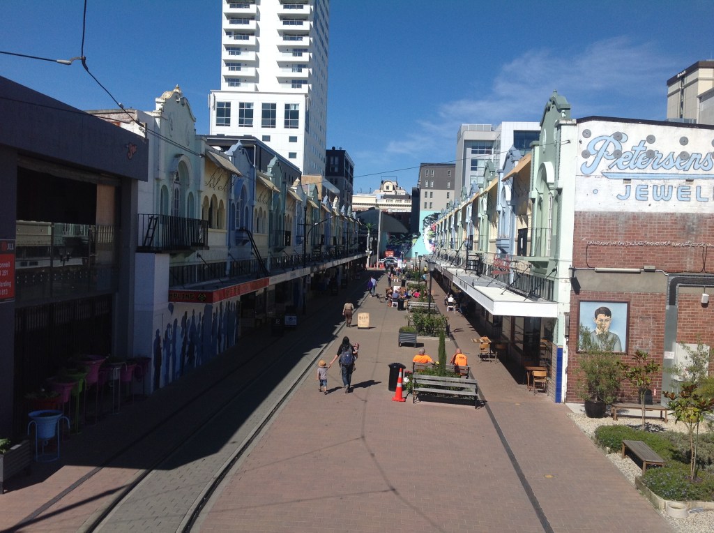 Na sliki zgoraj je lepo vidna za to mesto značilna simbioza starih kolonialnih objektov z modernimi poslovnimi prostori. Ulica ima pomenljivo ime New Regent Street, stavbo v ozadju pa bodo verjetno zaradi uničene statike morali podreti. Ekonomisti so potresno škodo ocenili na 40 milijard novozelandskih dolarjev, po njihovih ocenah pa bo trajalo od petdeset do sto let, da bodo mestno infrastrukturo povrnili na stanje pred potresom.