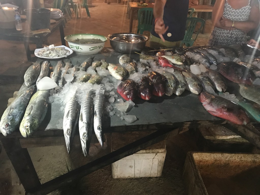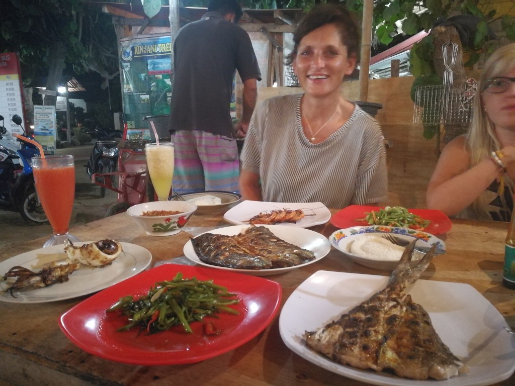 V Indoneziji smo milijonarji. Ko namreč zamenjaš ali dvigneš sto evrov, dobiš zanje milijon in pol indonezijskih rupij. Navdušenja je hitro konec, saj za vsako reč plačuješ in hitro kopnijo, a preračun v domačo valuto vseeno pokaže, da je vse v osnovi precej ceneje. Večerjo na fotografiji spodaj smo mi trije recimo plačali 400.000 rupij. Sliši se grozljivo, vendar je to dobrih 26 evrov za dvokilsko divjo ribo, škampe in lignja, vključno s pijačo.