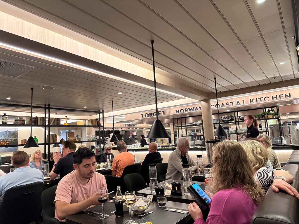 Midva neutrudno jeva morske sadeže in zelo raznovrstno zelenjavo pri skoraj vseh obrokih, za naše nemške sopotnike ali lakotno krizo je vedno na voljo tudi dobra stara svinjina ali klobase. Pri večerji popijeva kozarec vina, preostanek maliganov nadoknadiva v kabini z viskijem iz beneškega duty free-ja. Ne bom utrujal s podrobnostmi, a cene vsega, kar je ekstra, so zelo norveške. Bančno kartico sem povezal s kartico sobe in bolečino plačila prestavil na zadnji dan. Prosim, bodite dosegljivi, če bo potrebno plačati varščino 😁.