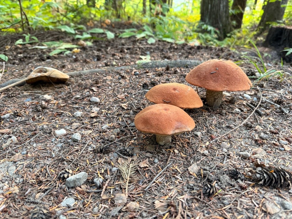 Čeprav je nabiranje gob v Kanadi načelno dovoljeno, za vse nacionalne in pokrajinske parke veljajo precej strožji predpisi. Narava in njeni prebivalci so na prvem mestu in so visoke tudi zagrožene kazni. Tile trije prijateljčki na sliki spodaj so se razkazovali tik ob potki sredi kampa in v dveh dneh se jih ni nihče dotaknil, čeprav sem jih že videl v rižoti: