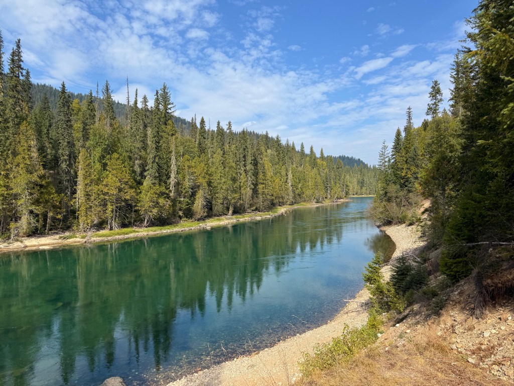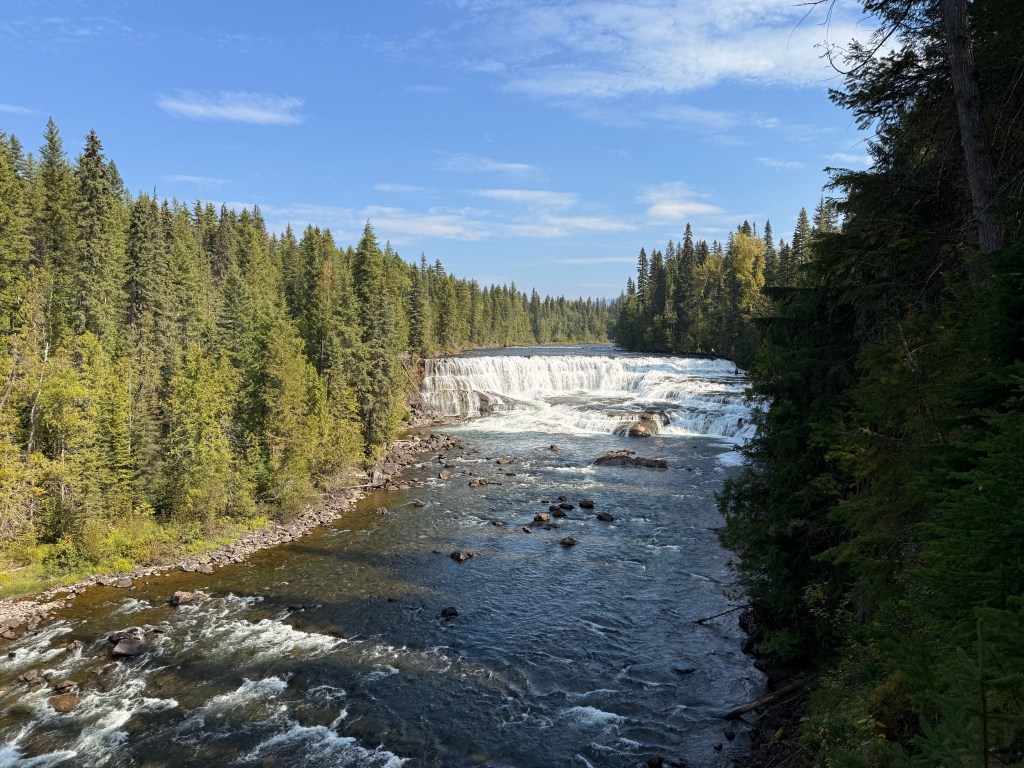 Na srečo na tako dolgi poti ni bilo kaj prida zanimivosti, ki bi naju pretirano zadrževale. Pokrajina se je vmes iz bogato gozdnatega spremenila v pravo dolgočasno stepo in se proti koncu znova pogozdila in višinsko razgibala. Wells Gray je menda skriti biser Britanske Kolumbije in je kot že povedano samo provincialni park za razliko od bolj razvpitih nacionalnih Jasper in Banff, ki ju tudi še imava na meniju. Res gre za prelepo nedotaknjeno divjino, brez elektrike, telefonskega signala in interneta. Zadnjih 23 kilometrov je za nameček še makadamskih, da v avtodomu vse poskakuje in veselo razgraja. Včerajšnji dan sva torej v celoti preživela v gozdu, ob jezeru in občudovala vodo in slapove.