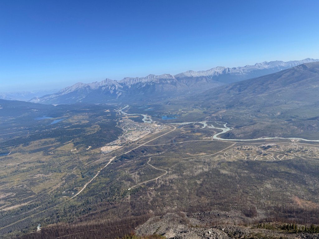 Jasper je obenem tudi železniško središče, kjer skozenj vsakih nekaj minut vozijo tovorni vlaki, menda dolgi celo do pet kilometrov. Kam se vsa ta roba prevaža, bo potrebno še raziskati. Kot rečeno, so Jasper lansko leto hudo opustošili gozdni požari in je pokrajina povsem spremenjena. Če je soditi po nepoškodovani okolici, je bil celoten park v zelenem gozdičku s posejanimi modrimi jezerci in vijugasto sivozeleno reko Athabascan. Dan je bil znova brez oblačka in kot nalašč za vzpon z žičnico na bližnji Whistlers Mountain.